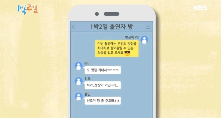 1박2일 본인의 멋짐을 최대치로 끌어 올릴 의상을 입고 오라는 방글pd님의 카톡에 입고온 멤버들의 의상 막이슈 쭉빵카페